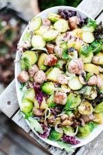 Sałatka z brukselką i salsiccia 288Szybki obiad w tygodniu…Sałatka z brukselką i salsiccia z dodatkiem ziemniaczków, pieczarek i cebuli. Smaczna i pożywna. Kolorowa i zdrowa. Brukselka dominuje na sklepowych
