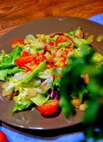 Sałatka z pomidorkami i cieciorką 230Polecam kolejna sałatkę z cyklu " co się na winie ". Połączyłam pomidorki z cebulką, mozzarellą i cieciorką. Całość połączyłam musztardowym sosem. Sałatka wyszła bardzo dobra a ze
