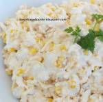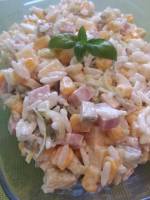 SAŁATKA Z RYŻEM I SZYNKĄ 1269Składniki: 1 torebka ugotowanego ryżu (100g) 1 puszka kukurydzy konserwowej 4-5 ogórków konserwowych 200g miękkiego sera żółtego 150g szynki konserwowej mały por majonez sól pieprz