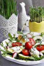Sałatka świąteczna z jajkiem 222Sałatka na Święta Wielkanocne nie musi być nudna i nie musi to być sałatka jarzynowa ! Do przygotowania tej sałatki wystarczy nam świeża rukola, jajka ugotowane na