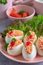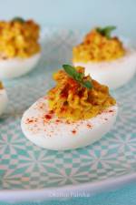 Faszerowane jajka z curry 124dekoracji. Warto wykorzystać je jako element większej deski przekąsek. Dla tak przygotowanych jajek idealnym towarzystwem będą roladki z szynki lub koreczki z szynką . Możesz również zrobić do nich prostą sałatkę i goście powinni być przeszczęśliwi. Czy faszerowane jajka z curry można przygotować z wyprzedzeniem? Niewątpliwą zaletą tego przepisu jest fakt, że jego wykonanie nie zajmuje wiele czasu. Tak naprawdę(...)samego względu możesz przygotować je z wyprzedzeniem, tak aby spokojnie czekały na przybycie gości. Ważnym jest tylko, aby je przykryć, co zabezpieczy farsz przed obsychaniem. Jakie jajka zrobić na Wielkanoc? Nadziewane jajka to jedna z moich ulubionych, wielkanocnych przekąsek. Faszerowane jajka z curry wręcz idealnie wpisują się w świąteczne menu, jednak warto przygotować także inne warianty nadzień, tak aby każdy