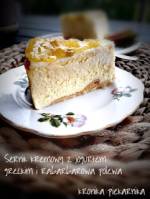 Sernik podwójnie kajmakowy z pianką i "Gorzka pomarańcza" 220masy krówkowej / kajmakowej 1 lekko kopiasta łyżka żelatyny spożywczej 2 łyżki gorącej wody ewentualnie cukier puder do smaku Dodatkowo kilka kostek gorzkiej czekolady 16 herbatników Formę wyłożyć papierem do pieczenia i herbatnikami. Żółtka oddzielić od białek. W dużej misce utrzeć masło z cukrem i cukrem waniliowym. Stopniowo dodawać po jednym żółtku. Ucierać dalej na puszystą masę. Włączyć piekarnik(...)połączenia składników. Pianę z białek przełożyć do masy serowej i delikatnie wymieszać. Masę serową wyłożyć na herbatniki, wyrównać powierzchnię. Włożyć blachę do piekarnika i od razu zmniejszyć temperaturę do 160 stopni C. Piec 60 minut na rumiano. Upieczony sernik dokładnie ostudzić. Sernik musi być bardzo zimny. Zimną śmietanę ubić na sztywno. Do śmietany dodać masę krówkową