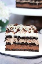 Czekoladowe ciasto Merci bez pieczenia 299Przepis na ciasto Merci na herbatnikach to potrójnie czekoladowe ciasto bez pieczenia na herbatnikach. Przygotujesz je na bazie mascarpone i bitej śmietany. Ciasto jest bardzo proste