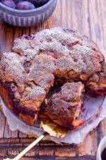 Korzenne ciasto ze śliwkami 55Przepis na ciasto, które już nieco zwiastuje koniec polskiego lata. Jest bardzo aromatyczne, pachnące cynamonem i kardamonem, pełne śliwek i chrupiącej kruszonki z orzechami. Samo ciasto