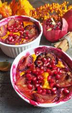 Dyniowe skyrniki ze śliwką 96Skyrniki w pięknym jesiennym kolorze, z dodatkiem śliwek i pestek owocu granatu. Deser bez dodatku cukru - można dosłodzić np. miodem. Składniki: pół dyni Hokkaido, 150