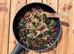 Sałatka z wędzonym serem kozim, burakiem i borówkami 171kupujemy już ugotowanego. Przestudzony i obrany burak kroimy w plastry, a następnie na cieniutkie paski – my swojego buraka potraktowałyśmy spiralizerem (tzw. krajalnicą, temperówką do warzyw) i otrzymałyśmy buraczane spaghetti. Pestki dyni prażymy na suchej patelni Składniki na sos mieszamy ze sobą, doprawiamy solą i pieprzem. Szpinak myjemy, osuszamy i układamy na talerzu. Na szpinaku układamy spaghetti z buraka, polewamy