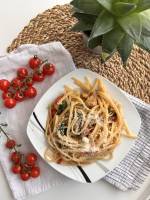 Spaghetti z wędzonym łososiem w śmietanowym sosie 221Pyszny wędzony łosoś, sos śmietanowy i makaron spaghetti, czyli składniki które potrzebujemy do przygotowania poniższego dania. Przepis dla osób, które uwielbiają smak wędzonego łososia. Zamiast makaronu pszennego użyłam pełnoziarnistego, aby danie obiadowe było bardziej sycące. Składniki na 2 porcje: 200 g wędzonego łososia (ja użyłam łososia wędzonego na ciepło) 2 łyżki mleka 5-6 łyżek śmietany(...)suszone pomidory w zalewie z oliwy z oliwek 1 ząbek czosnku makaron pełnoziarnisty do spaghetti sól, pieprz 2 łyżki masła 1/4 pęczka zielonej pietruszki 1. Na początku wlać wodę, lekko osolić i gdy zacznie wrzeć dodać makaron. Gotować go zgodnie z instrukcją na opakowaniu. W międzyczasie na patelni (na średnim ogniu) rozpuścić masło. 2. Na rozpuszczonym maśle przesmażyć posiekany
