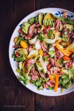 Pyszna tajska sałatka z wołowiną 234Kolorowa, lekka, a zarazem treściwa tajska sałatka z wołowiną i obłędnym, pełnym smaków sosem. Idealna propozycja na zdrowy obiad lub kolację. Sałatka z wołowiną nie jest