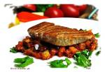 Steki z tuńczyka na ratatuj 162Tuńczyk podany na warzywach, polecamy. Składniki 2 steki z tuńczyka (około 300 g) mały bakłażan mała cukinia 2 małe papryki pomarańczowa i żółta 2 pomidory