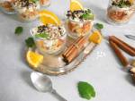 POMARAŃCZOWA SZARLOTKA Z ORZECHAMI BRAZYLIJSKIMI 121Pomarańczowa szarlotka z orzechami brazylijskimi i gorzką czekoladą to niebiańskie aromaty ukryte w szklankach. Pomarańczowa szarlotka to nic więcej jak nuta pomarańczy, obłędne słodkie jabłka, cynamon