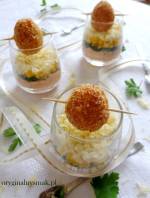 Mini sałatka z tuńczykiem i jajkiem przepiórczym w serowej skorupce 222Kolejna przekąska, która sprawdzi się na Święta lub Sylwestra. Tym razem bardziej elegancka. Warstwowe mini sałatki z tuńczykiem, kukurydzą, natką pietruszki i serem, udekorowane przepiórczymi jajeczkami