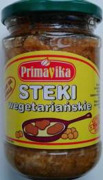 Steki wegetariańskie 210Skład: proteina sojowa niemodyfikowana genetycznie, oliwa, przyprawy, kwas askorbinowy (witamina C) – przeciwutleniacz. Zawiera soję, gorczycę, śladowe ilości selera i glutenu. Firma: Primavika. Cena: ok. 9 zł