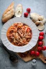Strogonow z boczniaków 148Strogonow z boczniaków Dzień dobry! Dzisiaj chciałam zaprosić do wypróbowania mojego przepisu na Strogonowa z boczniaków czyli pyszne grzyby w sosie śmietanowo – pieczarkowym. To moja wariacja wegetariańska na temat tradycyjnego strogonowa z wołowiny. Można podać go z pieczywem, z ryżem, ale również z kaszą czy makaronem. Fajnie też sprawdza się podany na chrupkim, stostowanym pieczywie. Polecam. PRZEPIS NA STROGONOW(...)puszka pomidorów siekanych – u mnie 1 słoik moich pomidorów wekowanych 100g śmietany 18% sól pieprz 1 łyżeczka papryki słodkiej 2 ząbki czosnku 6 łyżek oleju Jak zrobić strogonow z pieczarek: Najpierw boczniaki myjemy i zostawiamy na durszlaku lub ręczniku kuchennym do osuszenia. Cebulę obieramy, kroimy na pół a następnie w plasterki – tak powstałe półplasterki wrzucamy na patelnię z rozgrzanym