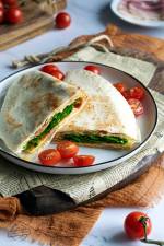 Tortilla to rodzaj cienkiego placka, który może być stosowany jako baza do innych potraw. Dzisiaj zapraszam Was na pyszne tortille z dodatkiem łososia i warzyw. Połączenie łososia i szpinaku - na pewno Was nie zawiedzie. Przepis dodaje do akcji Czas na szpinak 4! Składniki na 2 porcje: 250-300 g świeżego łososia 2 pomidory 1 ogórek kiszony lub świeży(...)garście świeżego szpinaku sos czosnkowy (1/2 szklanki jogurtu, 3 łyżki majonezu, 1 ząbek czosnku) 4 sztuki tortilli sól, pieprz przyprawa do sałatek sok z 1/2 cytryny olej do smażenia Łososia umyć, osuszyć i przyprawić sola, pieprzem, przyprawą do sałatek i na sam koniec skropić sokiem z cytryny. Na patelni rozgrzać olej i przesmażyć łososia. Gdy mięso się zetnie - przygotowanego łososia