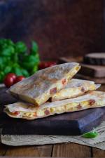 Z Majeczką w kuchniPrzepyszna propozycja na śniadanie czy kolację, choć nie tylko Jajecznica z boczkiem i żółtym serem w tortilli, czyli pyszna jajeczna quesadilla. Moim zdaniem jest to sycąca i niebanalna propozycja, w której smaku z miejsca można się zakochać. Oczywiście pod warunkiem, że jest się jednocześnie fanem jajecznicy Jedną porcję zjedliśmy na pół na świeżo, za to zdjęcie drugiej robiłam już(...)świeżo. Na drugim zdjęciu quesadilla odgrzana krótko w mikrofalówce. 6 jajek 2 łyżki mleka 1/2 małej papryki kawałek boczku 4-5 garści tartego sera cheddar 4 małe tortille (około 20 cm średnicy) szczypta soli i pieprzu masło Boczek kroimy w kostkę. Wysmażamy na chrupko. Pozbawioną gniazda nasiennego paprykę kroimy w drobną kostkę. Jajka wybijamy do naczynia. Wlewamy mleko i lekko