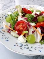 Sałatka z fetą i winogronami w ziołowym dressingu 229Dziś u mnie propozycja na szybką sałatkę, ale za to jaką! Połączenie słonej w smaku fety oraz słodkich pomidorków i jasnych winogron okazała się wow lubię