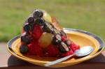 Torcik owocowy zatopiony w przezroczystej galaretce 183Torcik z soczystych, dojrzałych owoców lata zatopionych w przezroczystej galaretce. Prezentuje się imponująco za sprawą tęczy kolorowych, rozmaitych owoców. Torcik deserowy serwowany jest na zimno, co