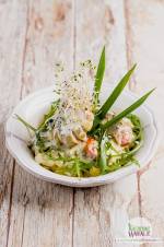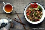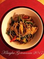 Stir fry z warzywami, kurczakiem w orzechach z makaronem gryczanym 274tutaj Przygotowanie: Wszystkie składniki marynaty połączyć ze sobą zamarynować kurczaka, umytego i pokrojonego w mniejsze kawałki. Odstawić na ok 2h aby ładnie kurczak przeszedł smakiem. Przygotować wszystkie warzywa: brokuł można ugotować ja przygotowałam go na parze, paprykę pokroić w paski, szczypiorek posiekać, pokroić na piórka cebulę. Makaron gotujemy według instrukcji na opakowaniu, odcedzamy i przepłukujemy zimną wodą(...)wszystkie składniki mamy przygotowane to zaczynamy. Wok rozgrzewamy i dodajemy olej kokosowy wrzucamy kurczaka ruchem podrzucania obsmażamy go z każdej strony, aż się zarumieni, następnie posypujemy go mąką ziemniaczaną i dodajemy cebulę, paprykę i brokuł, chwilę podsmażamy ciągłymi ruchami podrzucania cały czas wszystko mieszamy. Dodajemy kiełki i makaron. Na sam koniec wlewamy pozostałą marynatę
