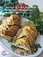 Kurczak w cieście francuskim ze szpinakiem i brokułami 406prosty w przygotowaniu kurczak. Sprawdzi się na różnych rodzinnych imprezach, ponieważ prezentuje się bardzo ładnie. A farsz? Szpinak z fetą i czosnkiem, brokuły i dużo sera. Czy nie brzmi to smacznie? 600 g fileta z piersi kurczaka Przyprawa do gyrosa 1 opakowanie ciasta francuskiego (25x40 cm) 2 łyżki masła(...)szpinaku (mrożonego) 3 ząbki czosnku 100 g sera feta 5 różyczek brokuła 200 g żółtego sera 1 jajko Sól Pieprz Filet z piersi kurczaka kroimy na 5 płatów. Nacieramy je przyprawą do gyrosa. Brokuł gotujemy do miękkości w delikatnie osolonej wodzie. Ser ścieramy na tarce o średnich oczkach. W garnku rozpuszczamy masło, dodajemy mrożony szpinak. Dusimy do miękkości, dodajemy przeciśnięty