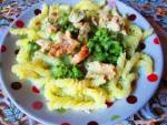 Makaron w sosie brokułowym z kurczakiem 210Smaczny pomysł na makaron. Składniki: 1 opakowanie makaronu grubego, ½ litra śmietany, 1 brokuł, 1 podwójny filet z kurczaka, ½ szklanki białego wina wytrawnego, olej do smażenia, sól do smaku, cukier do smaku. Wykonanie: Makaron ugotować według opisu na opakowaniu, a brokuł ugotować do miękkości w osolonej wodzie razem z cukrem lecz nie rozgotować. Mięso opłukać, pokroić w kostkę i usmażyć złociście