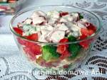 Sałatka warstwowa z kurczakiem i sosem czosnkowym 888Składniki: 1 puszka kukurydzy puszka czerwonej fasolki duży słoik pieczarek marynowanych 2 filety z kurczaka czyli jeden podwójny 6 jajek 1 brokuł sól, pieprz, papryka mielona ostra Sos czosnkowy: 3-4 łyżki majonezu 3-4 łyżki jogurtu naturalnego lub śmietany 18% 5 ząbków czosnku sól, pieprz Przygotowanie : Brokuł gotujemy w posolonej wodzie, jajka