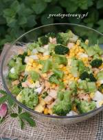 Prosta sałatka z brokułem 260zrobienia i smaczna. Polecam też sałatkę z brokułem i groszkiem , na którą prz epis znajdziecie też na blogu pod tym linkiem SAŁATKA Z BROKUŁEM Składniki: 1 brokuł 1/2 filetu z kurczaka 1 ząbek czosnku 1/2 łyżeczki przyprawy gyros 100 g sera żółtego 1 puszka kukurydzy sól i pieprz do smaku opcjonalnie majonez lub jogurt grecki Przygotowanie: Filet kurczaka kroimy