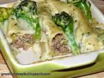 Cannelloni z porem i brokułem 390oznacza „dużą rurę". Jego puste wnętrze wręcz błaga o wypełnienie farszem. Moja polsko-włoska wersja tej potrawy, łączy popularny, włoski makaron z powszechnie uprawianymi w Polsce warzywami: porem i brokułem. Ciekawostka cytowana za Wikipedią - główne uprawy brokuła w Europie znajdują się m.in. właśnie w Polsce, poza tym też w Anglii, Francji, Hiszpanii i we Włoszech. Pan Mąż ochrzcił rury "prawdziwym(...)zapiekania FARSZ: 500g mięsa mielonego z indyka - choć tak naprawdę rodzaj mięsa zależy wyłącznie od fantazji kucharza: z kurczaka, z indyka, wieprzowe - do wyboru do koloru :) 2 duże pory - biała część + ok.5cm części jasnozielonej 2 jaja - całe 1 brokuł - korzeń do farszu, różyczki do zapieczenia z makaronem 3-4 łyżki sosu sojowego 1-2 łyżki bułki tartej - można użyć zamiennie