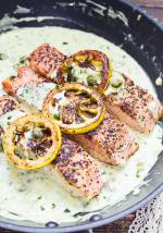 Łosoś piccata na wielkanocny obiad 453szybki i łatwy przepis na łososia. Piccata to właściwie sposób przyrządzenia, a nie nazwa potrawy. Do smażonego łososia przygotowałam pyszny sos z białego wina. Całość podałam z ryżem i brokułami. Proste i szybkie danie z łososia na obiad. Ciekawe, aromatyczne i intensywne w smaku. Sos na bazie smażonych kaparów, czosnku i białego wina świetnie komponuje się z łososiem . Lekko(...)łyżki masła 1 łyżka oliwy ½ czosnku solo, 4 ząbki 100 ml białego wina, wytrawnego 200 ml bulionu z kurczaka lub warzywny 150 g creme fraiche 150 g śmietanki 3 łyżki kaparów 5 plasterków cytryny 4 łyżki natki pietruszki Dodatkowo brokuły ryż Filet z łososia podziel na 5 porcji. Posól i popierz, odstaw na godzinę. Rozgrzej 2 łyżki masła