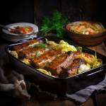 Żeberka pieczone z kapustą 72Żeberka pieczone z kapustą to jedno z tych dań, które od pokoleń goszczą na polskich stołach, zachwycając swoim smakiem i aromatem. To połączenie soczystego, miękkiego mięsa